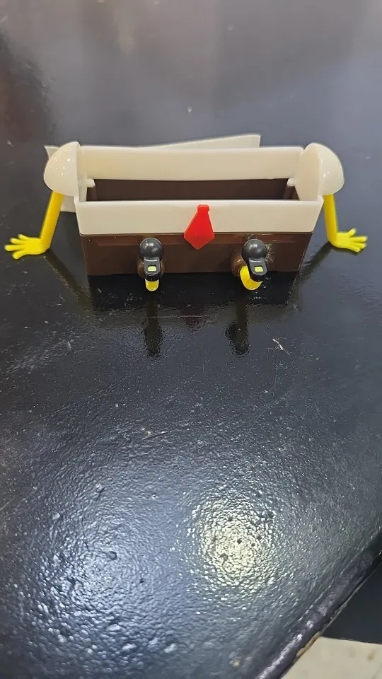 O suporte possui uma alça flexível ou sistema de encaixe que permite pendurá-lo diretamente na base da torneira ou em qualquer barra de suporte. Basta colocar a esponja dentro do compartimento do personagem. A gravidade faz o resto: a água escorre pelos furos inferiores direto para o ralo, mantendo tudo seco.